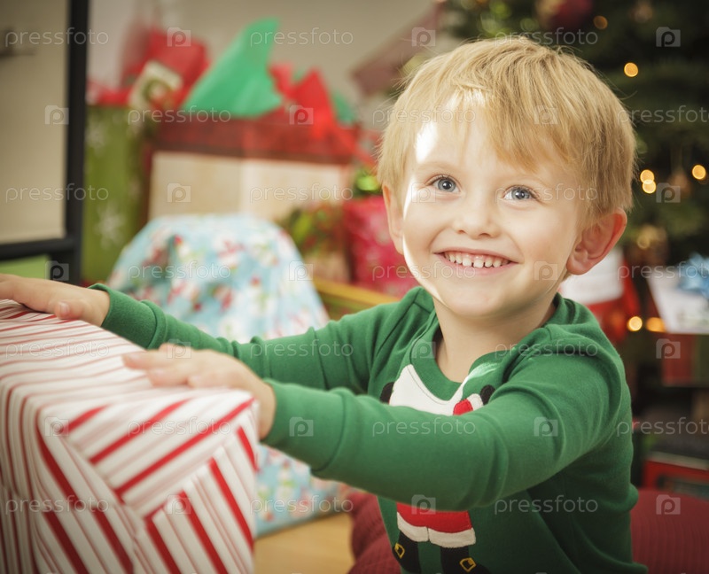 Мальчик радуется рождественскому утру возле елки