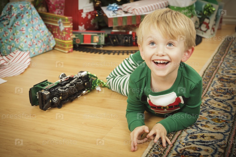 Мальчик радуется рождественскому утру возле елки