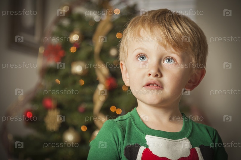Мальчик радуется рождественскому утру возле елки
