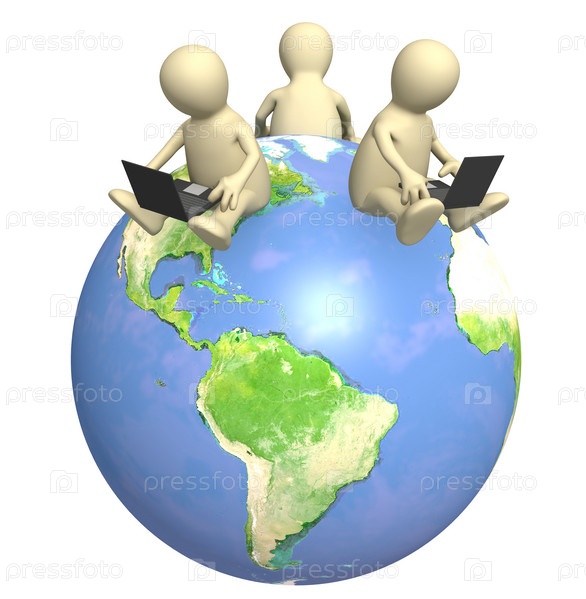 Человечки сидят на земном шаре с ноутбуками