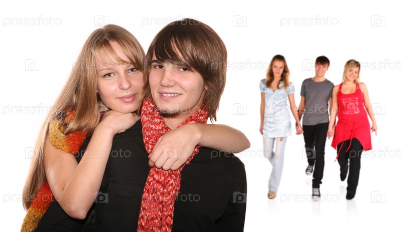 Молодая пара и группа друзей позади на белом фоне