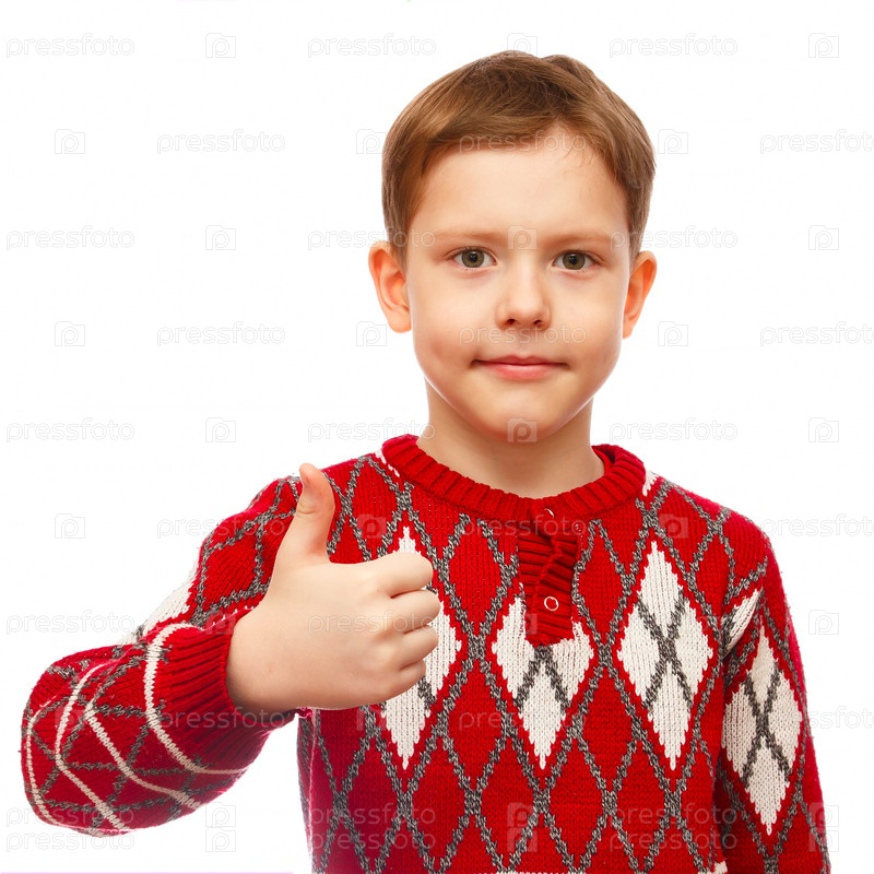 Веселый белокурый мальчик в красной кофте, поднял большой палец, изолировано на белом фоне