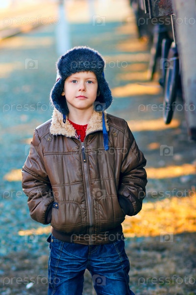 Бездомный мальчик в шапке и куртке мерзнет на улице