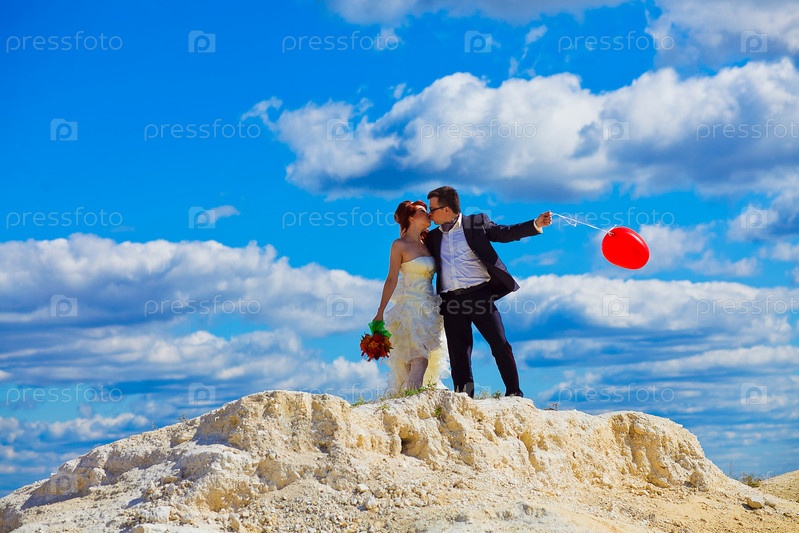 Молодожены целуются на белой скале на фоне голубого неба