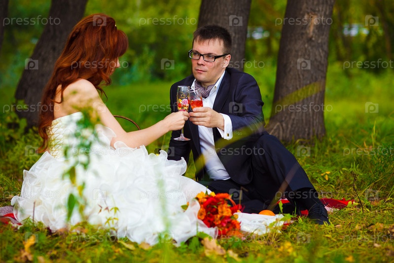 Жених и невеста сидят на зеленой траве, пикник в лесу