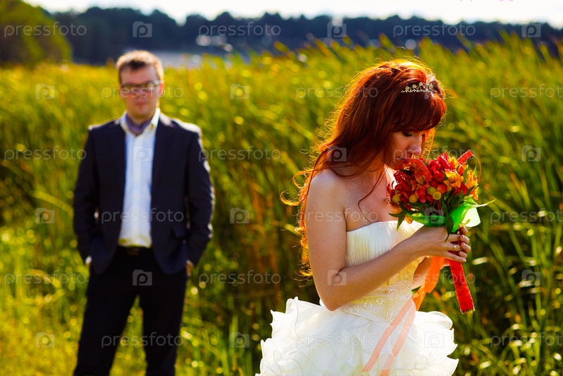 Невеста нюхает свадебный букет на фоне зеленой травы и жениха