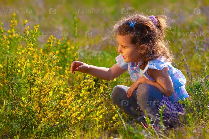 Маленькая девочка смотрит на желтый цветок (Chamaecytisus ruthenicus) в зеленом поле весной