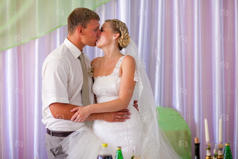 Жених и невеста целуются на банкете в зале в день свадьбы