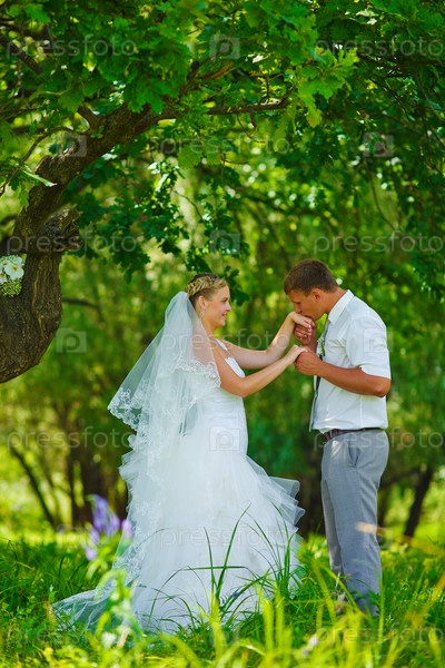 Жених целует руку невесты в зеленом лесу