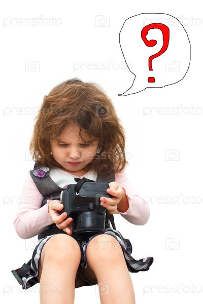 Маленькая девочка задумчивая девочка держит фотокамеру, изолировано на белом фоне