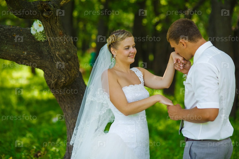 Жениха целует руку невесты, молодожены в зеленом лесу