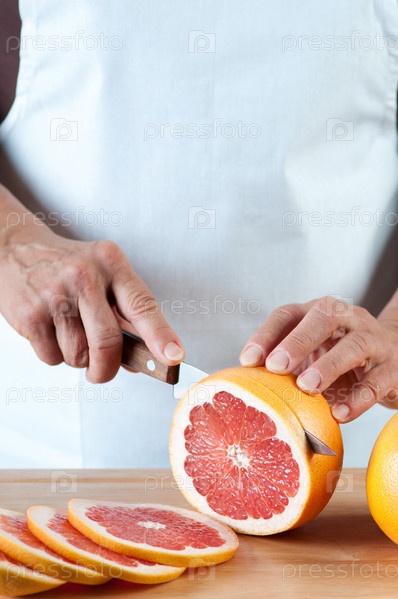 Женские руки режут свежий грейпфрут