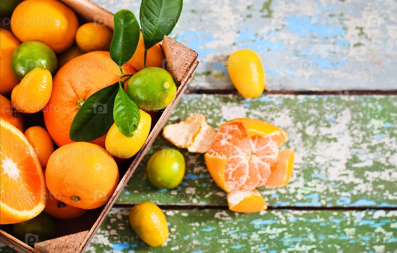 Свежие цитрусовые фрукты в деревянной коробке