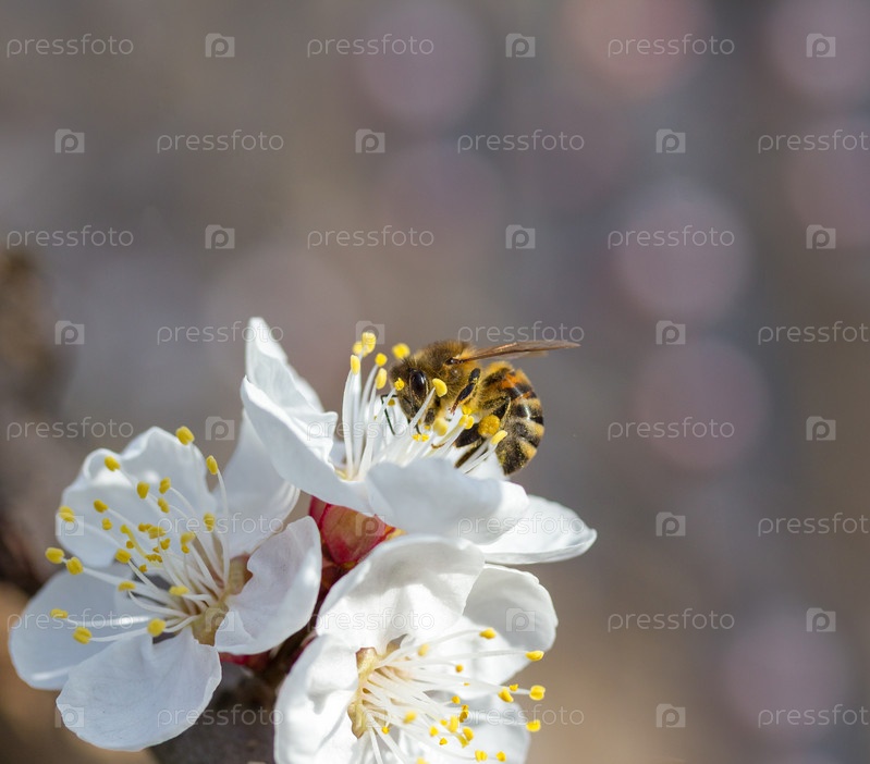 Пчела на цветущем вишневом дереве