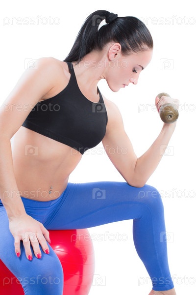 Молодая сексуальная женщина в спортивном бюстгальтере занимается с гантелями на белом фоне. Фитнес