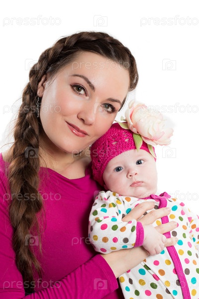 Счастливая мать с дочерью на руках, изолированная на белом фоне