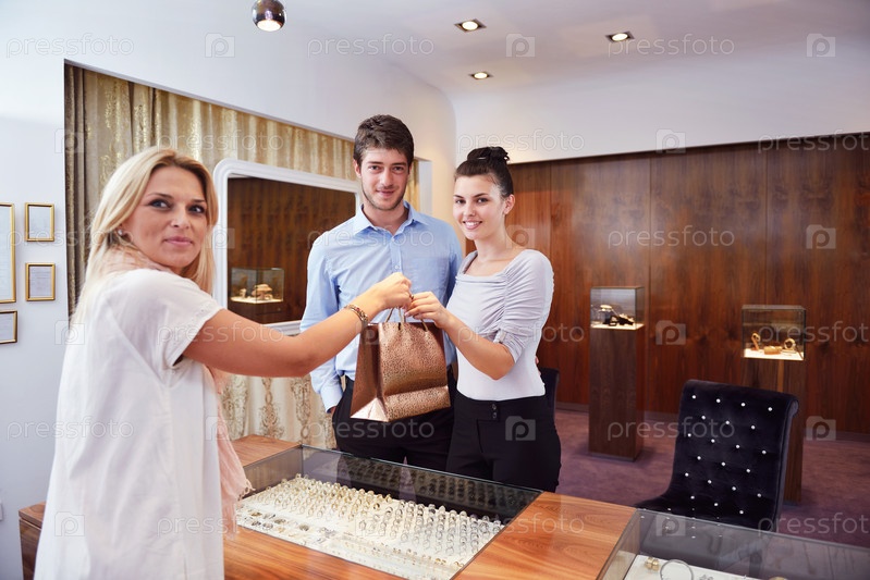 Счастливая молодая пара в магазине ювелирных изделий