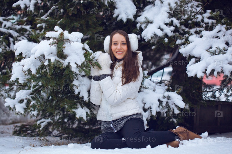 Женщина сидит в зимнем парке