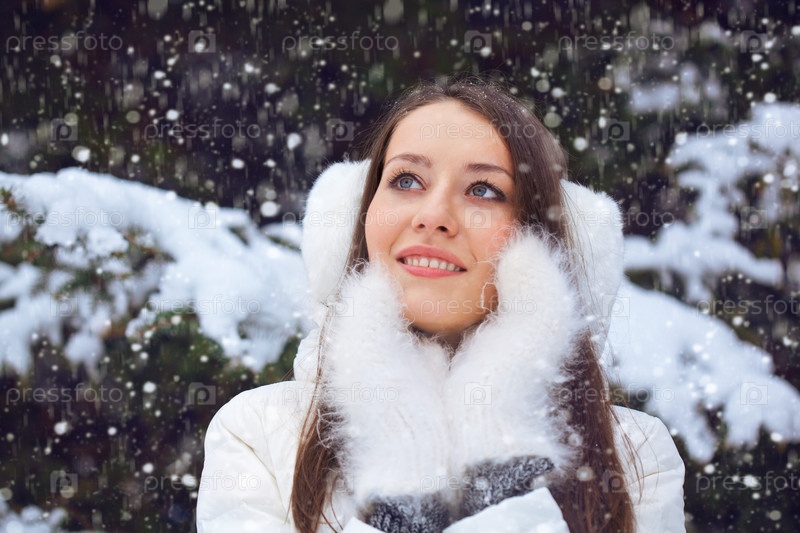 Красивая брюнетка стоит под снегопадом