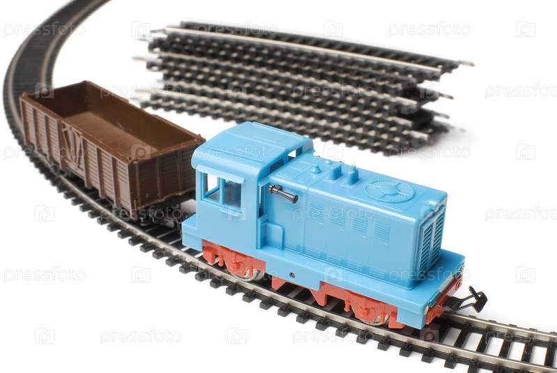 Игрушечный поезд с вагоном на рельсах, на заднем плане стопка рельс Изолировано на белом фоне