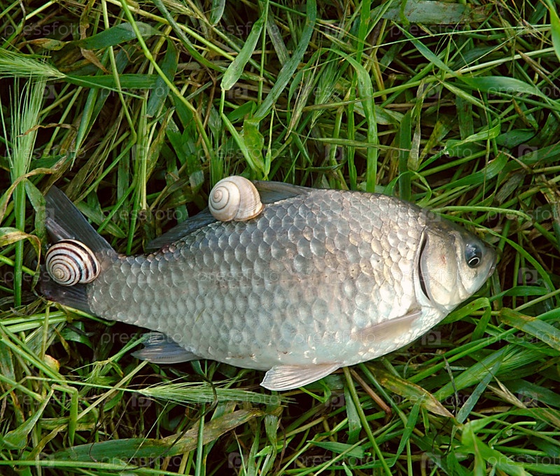Две улитки ползают по рыбе, которая лежит на траве