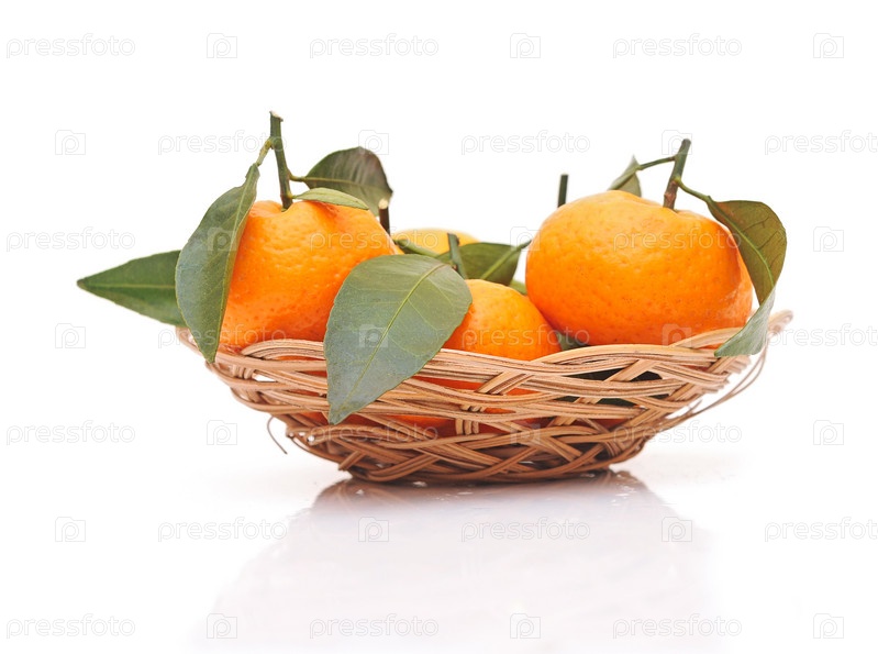 Мандарины с листьями в красивой корзине на белом фоне