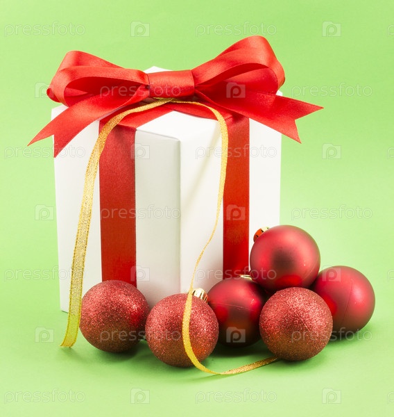 Белый подарок с красной лентой и елочные шары