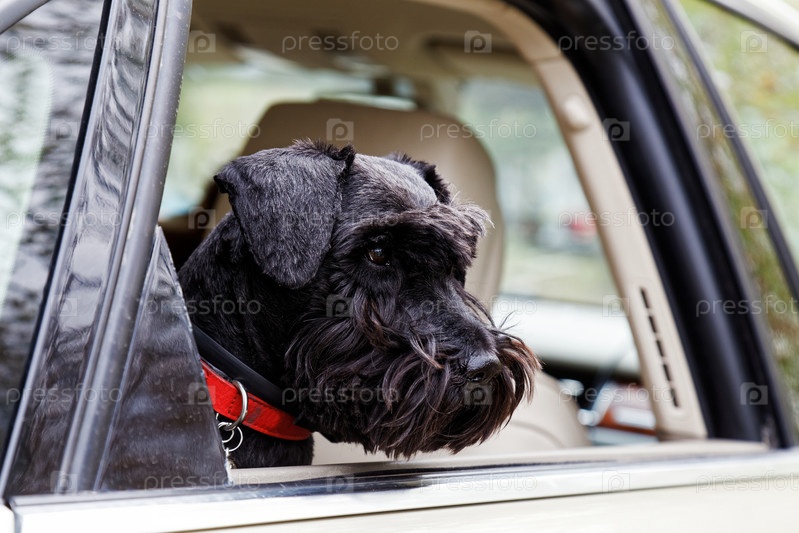 Черная собака цвергшнауцер смотрит в открытое окно автомобиля