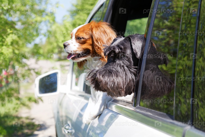 Две собаки смотрят в открытое окно автомобиля