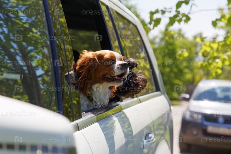 Две собаки смотрят в открытое окно автомобиля