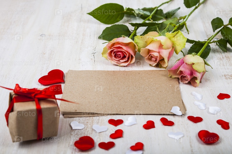 Розовые розы, сердце и открытка