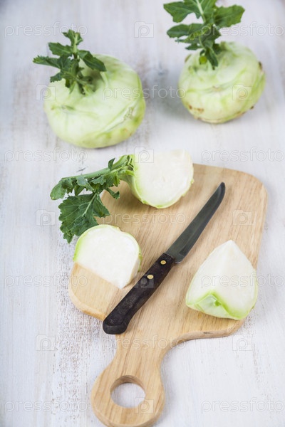 Рубленая кольраби и нож на разделочной доске