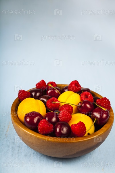 Зрелые ягоды и фрукты в тарелке