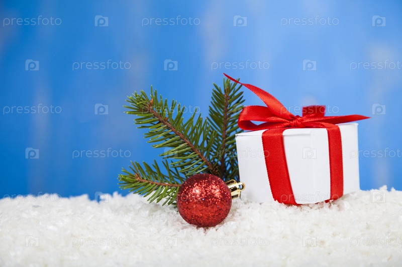Подарок с красным бантом на снегу