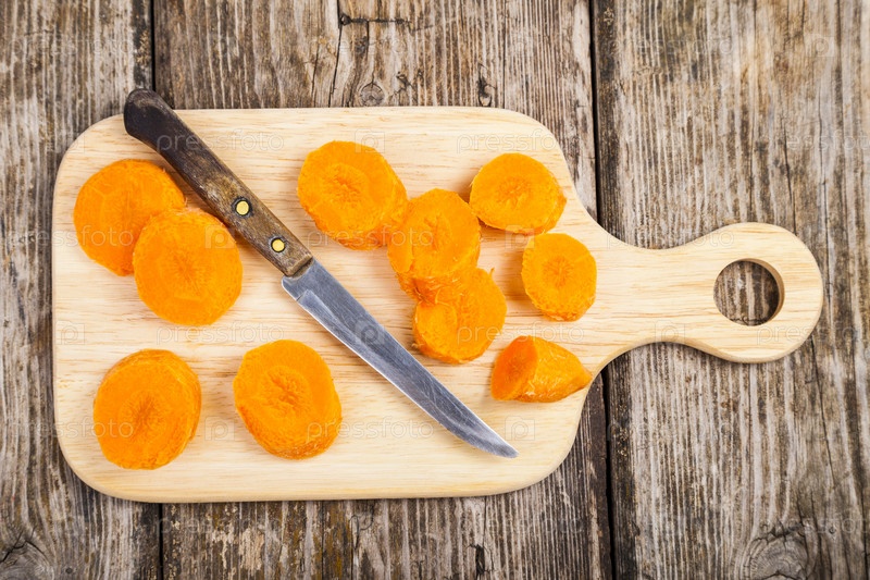 Нарезанная морковь и нож на разделочной доске