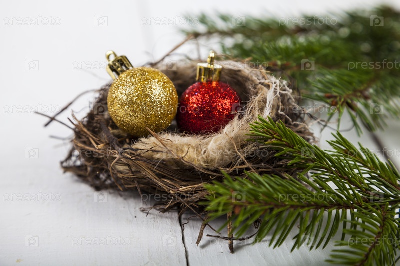 Новогодние шары в гнезде и еловые ветки