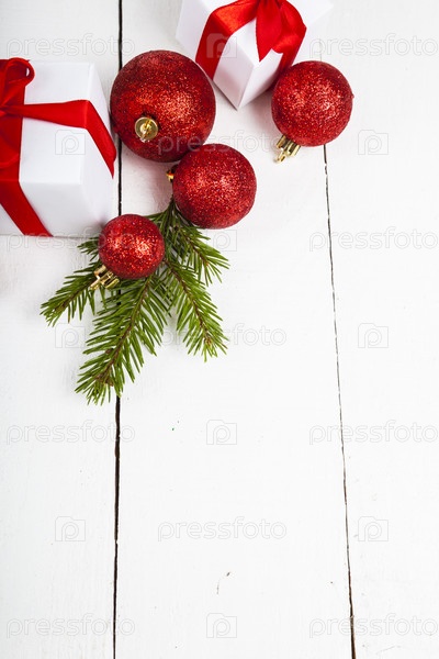 Подарки с красными бантами и рождественские украшения