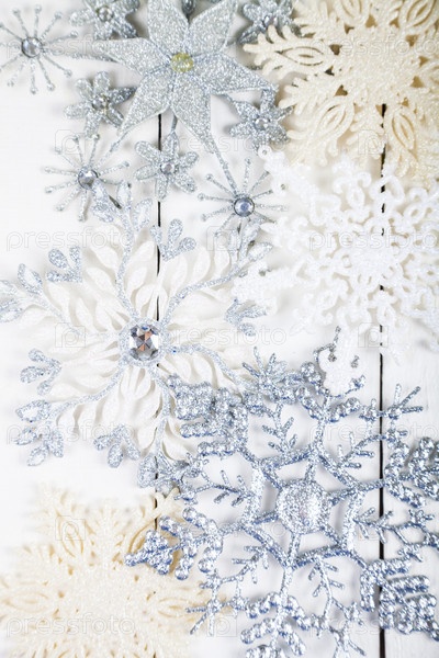 Серебристые снежинки на деревянном фоне