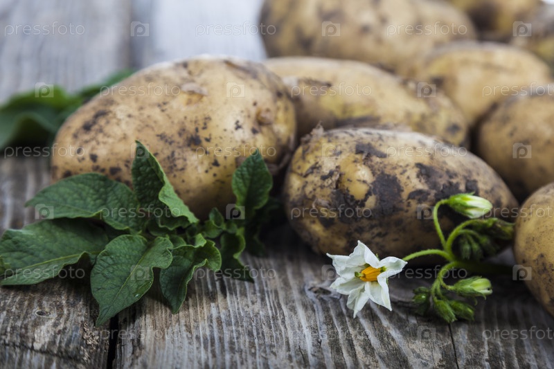 Сырой картофель с листьями и цветами