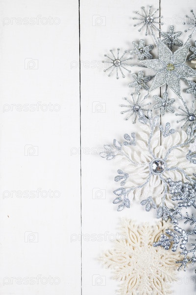 Серебристые снежинки на деревянном фоне
