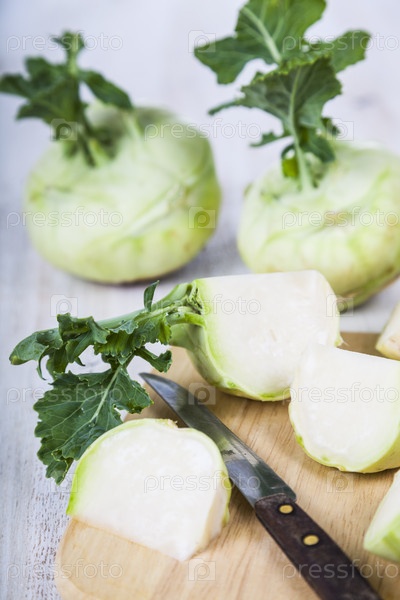 Кольраби и нож на разделочной доске