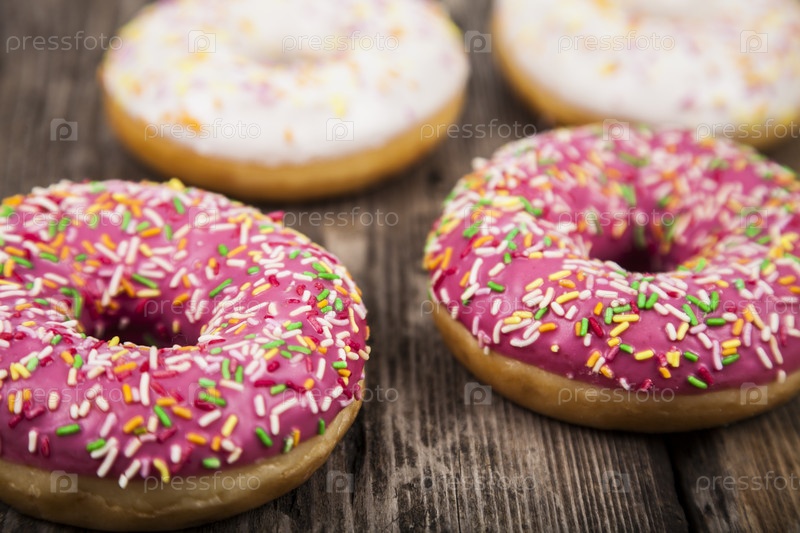 Разноцветные пончики на деревянном фоне