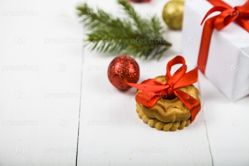Рождественское печенье, еловые ветки, подарок и шары