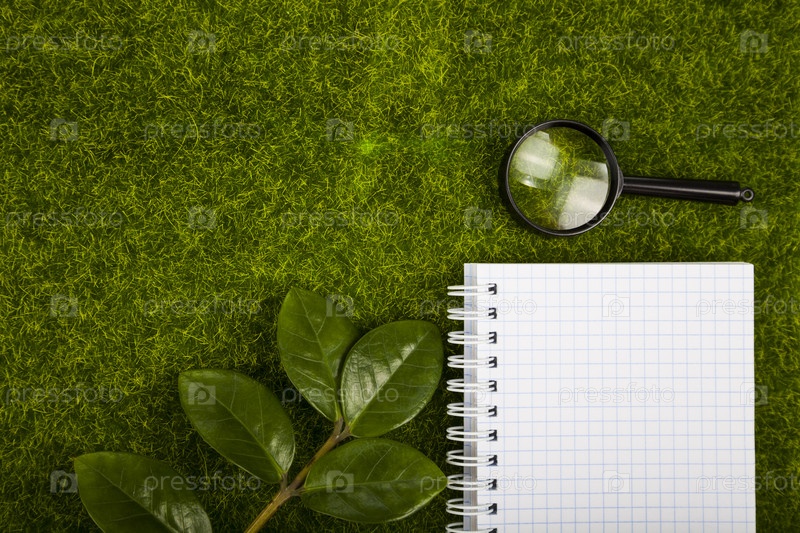 Блокнот с лупой и зеленые листья