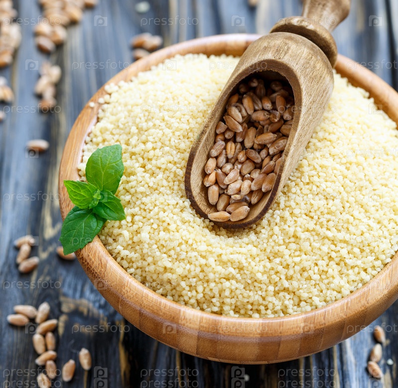 Совок с пшеницей в деревянной миске с кускусом