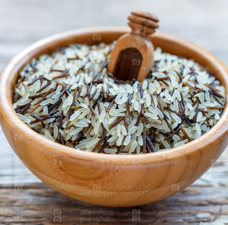 Деревянная чаша полна дикого и белого риса