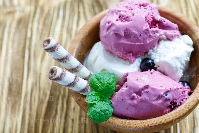 Ванильно-ягодное мороженое с вафельными трубочками в деревянной миске