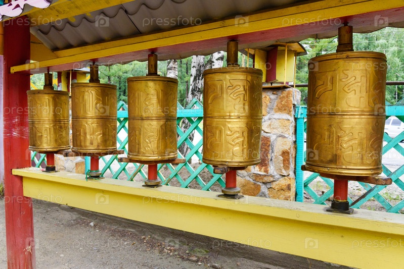 Молитвенные цилиндры в буддийский дацане Дечен Равжалин в Аршан. Россия