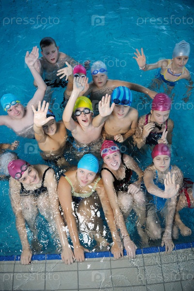 Группа счастливых детей в плавательном бассейне