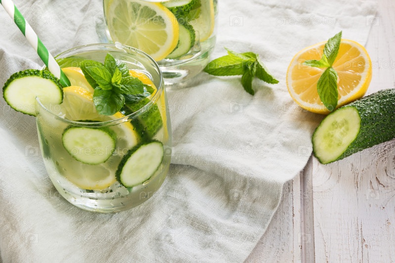 Летний освежающий коктейль с лимоном, огурцом, мятой и льдом